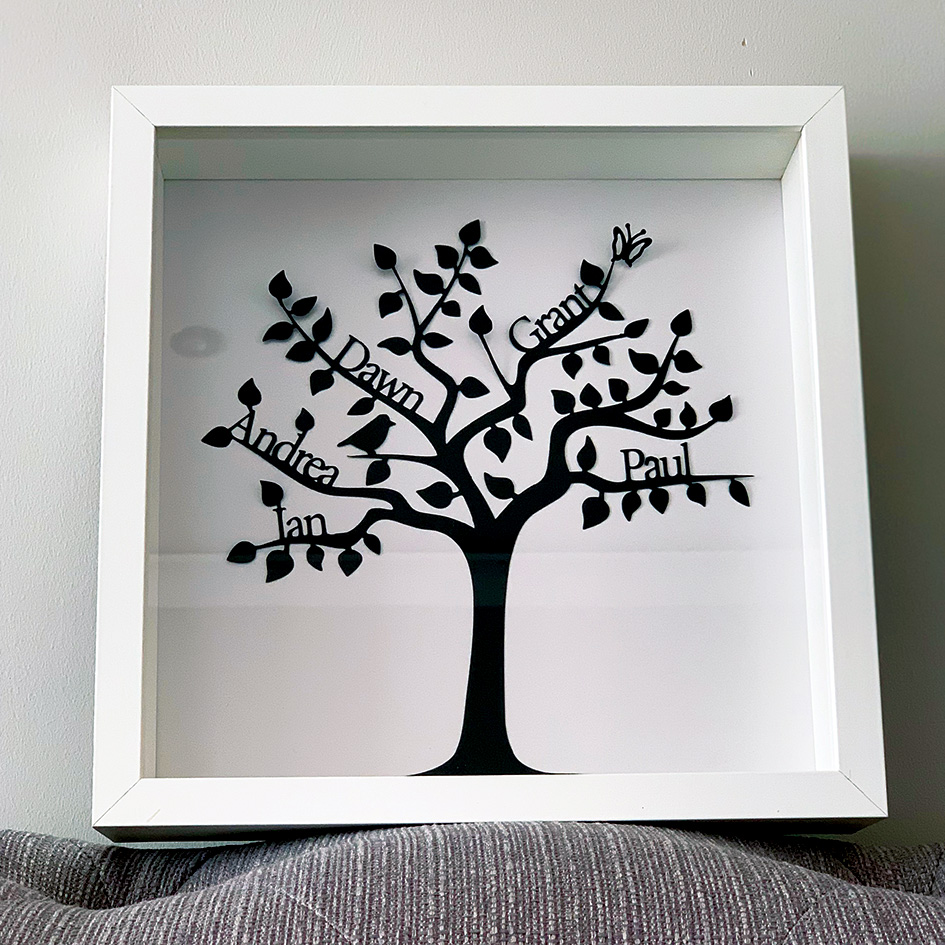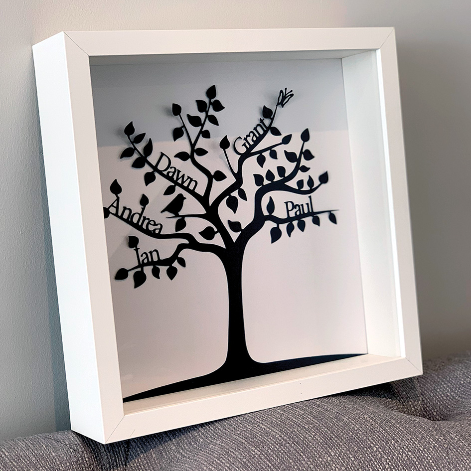 The Family Tree Papercut can be framed in your choice of either a Black or White Wood Frame, emphasising the outline of the Papercut. When framed the overall size is: 27cm x 27cm. A stand & saw tooth mount are included.