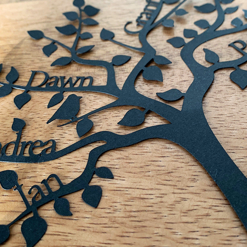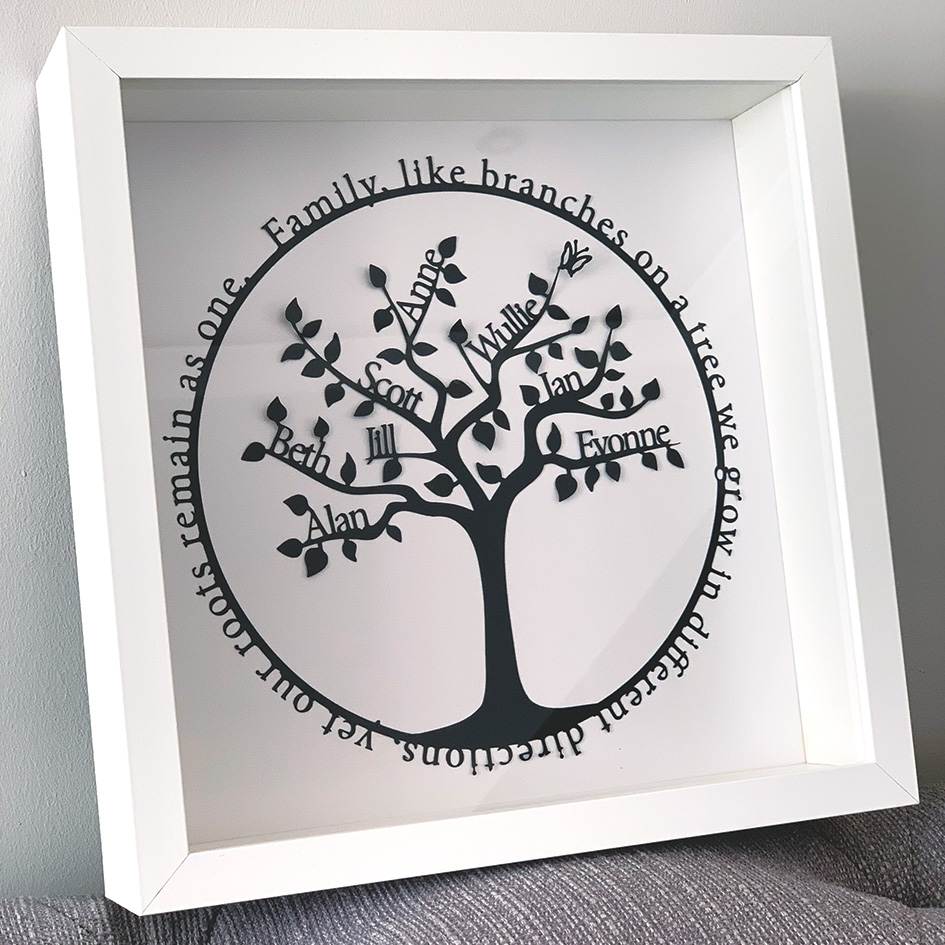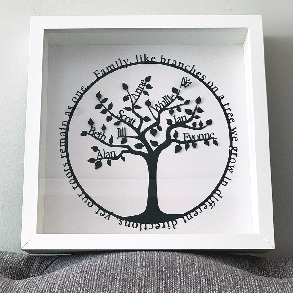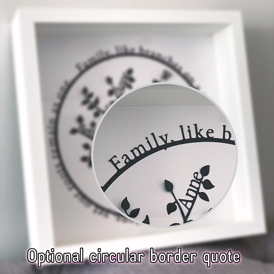This intriguing and eye catching family tree papercut is a unique and delightful gift. It is a gift that will be forever treasured and will always be proudly displayed. It makes a stunning present for a birthday or anniversary. You can add all of the family names up to a maximum of 8! You also have the choice of an optional circular border with the beautiful phrase “Family, like branches on a tree we grow in different directions, yet our roots remain as one.