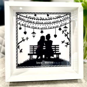 The Wedding Papercut can be framed in your choice of either a Black or White Wood Frame, emphasising the outline of the Papercut.